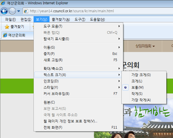 - 1. 인터넷 익스플로러 : 상단 메뉴의 보기 > 텍스트 크기 메뉴에서 설정