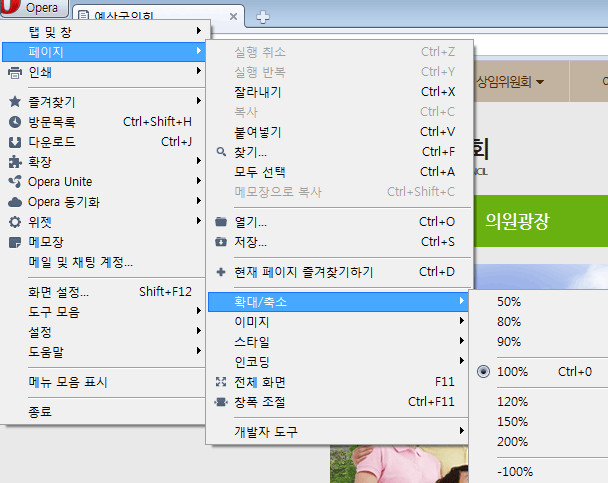 - 3. 오페라 : 왼쪽 상단 오페라 로고 > 페이지 > Zoom 메뉴에서 설정