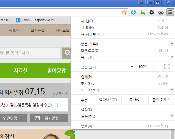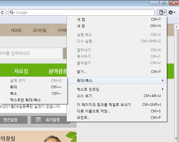 - 2. 파이어폭스 : 상단 메뉴의 보기> 크기조정 메뉴에서 설정